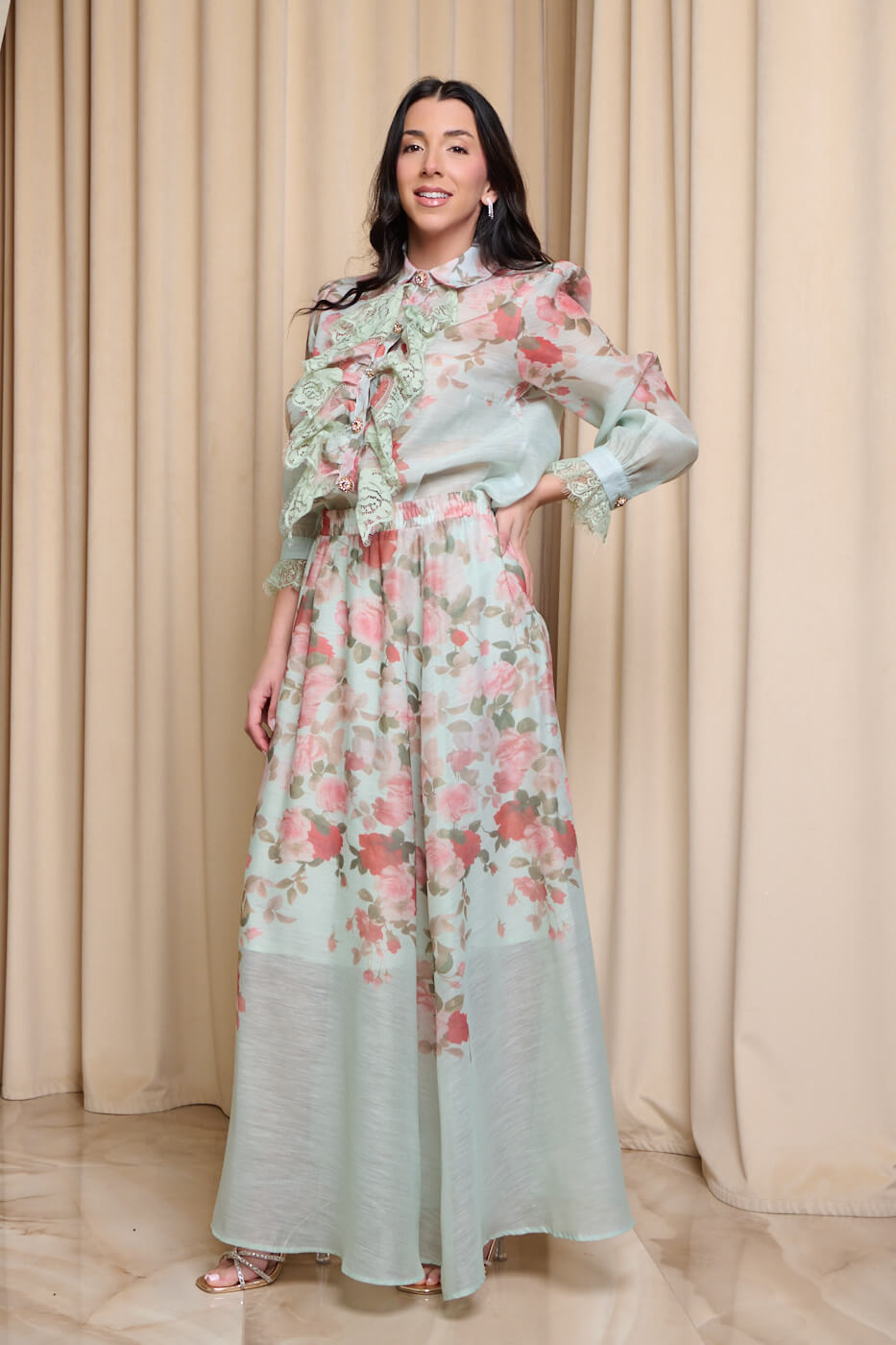 Σετ πουκάμισο – φούστα floral με δαντέλα και κουμπιά κόσμημα μέντα. Ένα κομψό floral σετ με λεπτομέρειες από δαντέλα. Διαθέτει ημιδιάφανο πουκάμισο  με πέτο γιακά και κάθετα βολάν με δαντέλα στην πατιλέτα. Τα μανίκια είναι μακριά με μανσέτα που κλείνει με κουμπί και τελείωμα δαντέλα. Κλείνει μπροστά με εντυπωσιακά κουμπιά – κόσμημα.  Η φούστα είναι σε άλφα γραμμή με εσωτερική φόδρα μέχρι το γόνατο και λάστιχο στη μέση. Ένα σετ που αποπνέει κομψότητα και ρομαντισμό.  Μπορεί να φορεθεί από το πρωί ως το βράδυ και να χαρίσει κομψές εμφανίσεις που κερδίζουν τις εντυπώσεις.