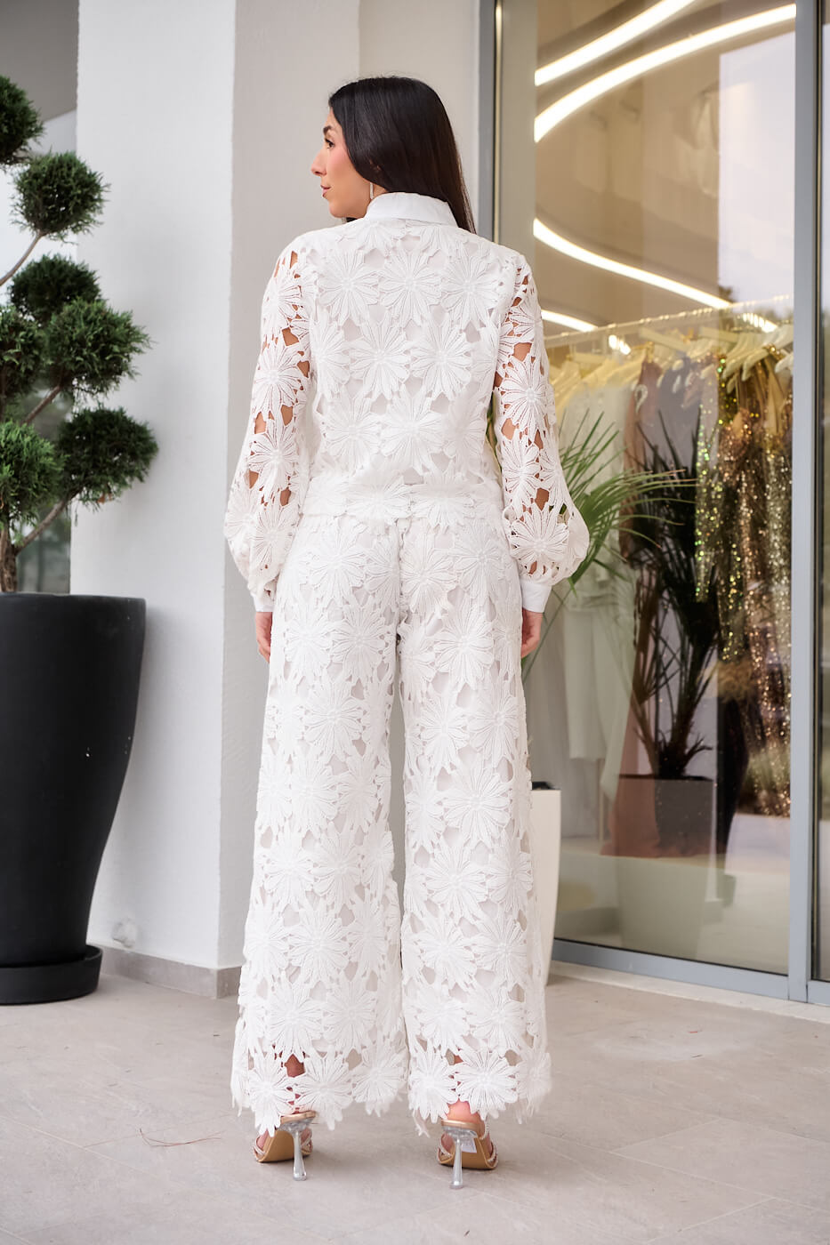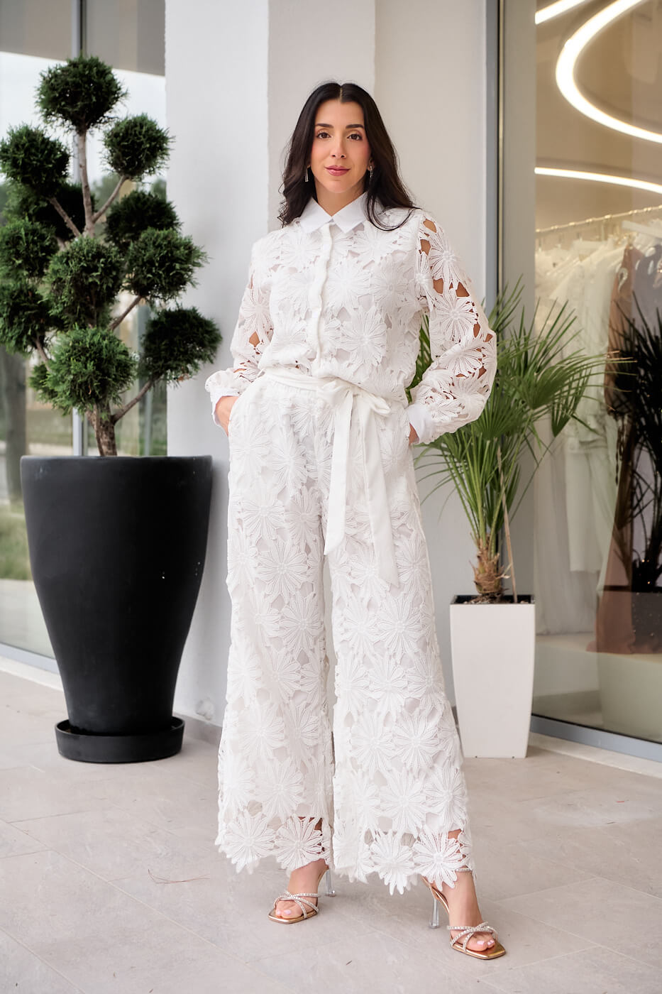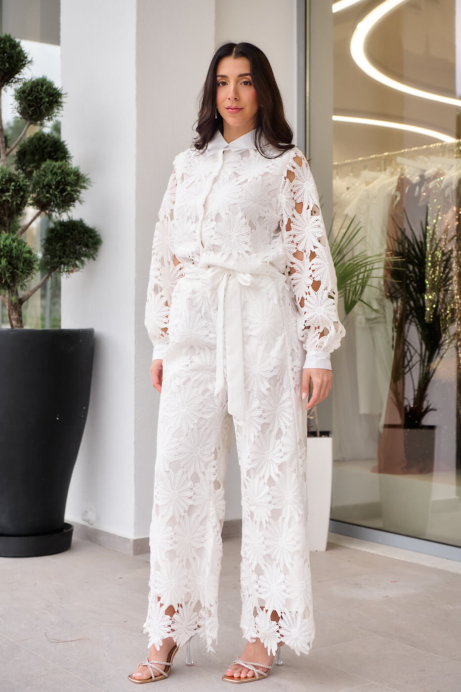 Ένα ιδιαίτερο σύνολο από κιπούρ δαντέλα σε λευκό χρώμα. Διαθέτει πουκάμισο με πέτο γιακά, εσωτερική φόδρα και κουμπιά μπροστά. Τα μανίκια είναι μακριά με δαντέλα χωρίς φόδρα και καταλήγουν σε λευκή μανσέτα με κουμπί. Το παντελόνι είναι σε ίσια γραμμή με λάστιχο στη μέση και εσωτερική φόδρα μέχρι κάτω. Διαθέτει δική του αποσπώμενη υφασμάτινη ζώνη.