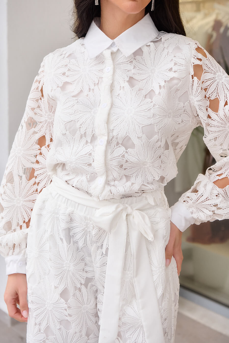 Σετ πουκάμισο-παντελόνι κιπούρ άσπρο. Ένα ιδιαίτερο σύνολο από κιπούρ δαντέλα σε λευκό χρώμα. Διαθέτει πουκάμισο με πέτο γιακά, εσωτερική φόδρα και κουμπιά μπροστά. Τα μανίκια είναι μακριά με δαντέλα χωρίς φόδρα και καταλήγουν σε λευκή μανσέτα με κουμπί. Το παντελόνι είναι σε ίσια γραμμή με λάστιχο στη μέση και εσωτερική φόδρα μέχρι κάτω. Διαθέτει δική του αποσπώμενη υφασμάτινη ζώνη. Ιδανικό για καθημερινές ή και επίσημες εμφανίσεις.