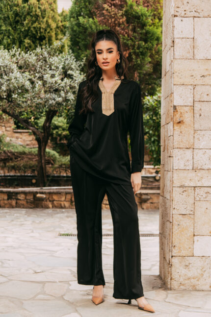 Σετ πουκάμισο-σορτς λινό με κιπούρ λεπτομέρεια μαύρο. Το πουκάμισο διαθέτει μάο γιακά, μακριά μανίκια με κιπούρ λεπτομέρεια στο τελείωμα. Είναι φοδραρισμένο