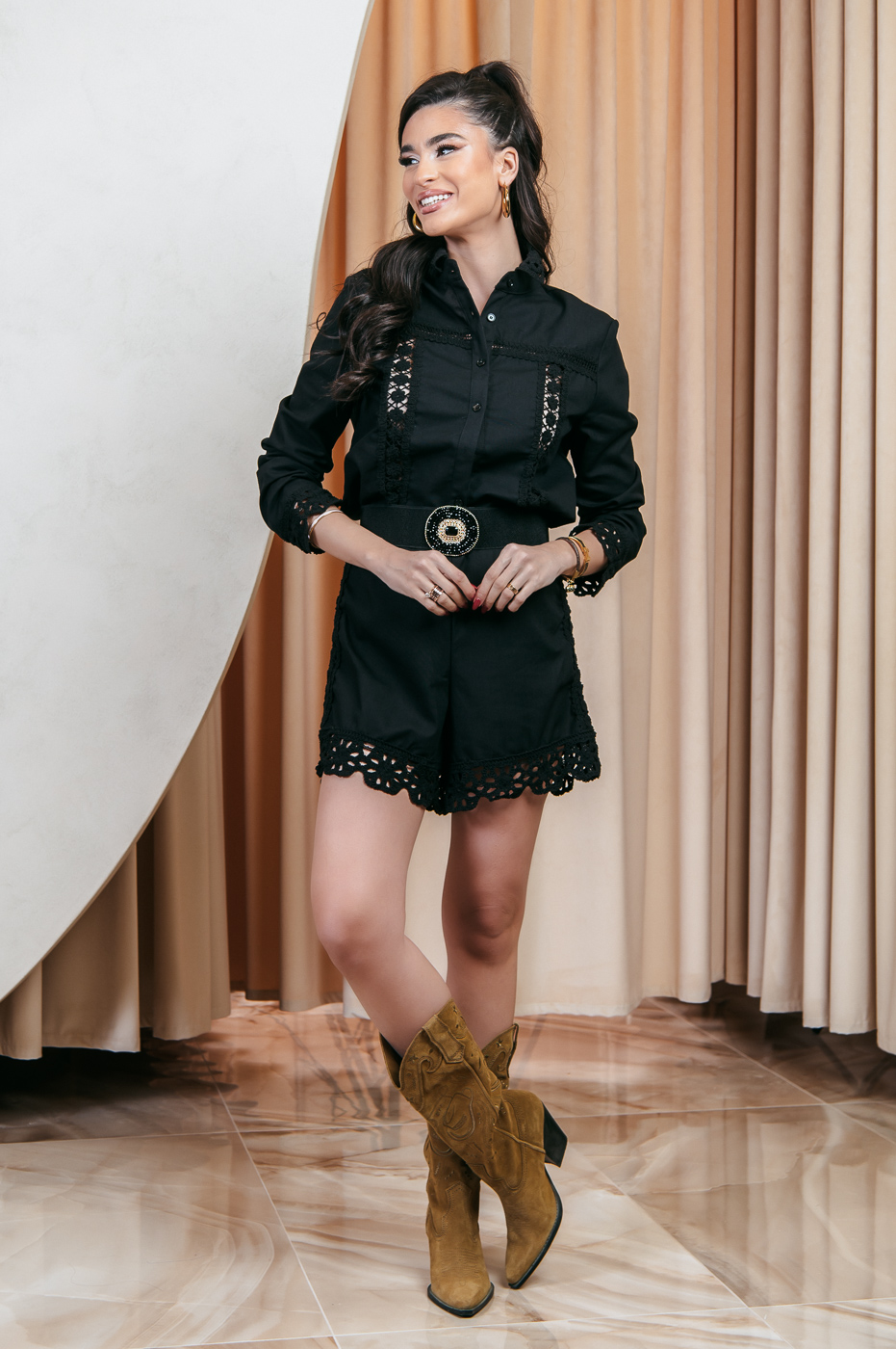 Σετ πουκάμισο-σορτς λινό με κιπούρ λεπτομέρεια μαύρο. Το πουκάμισο διαθέτει μάο γιακά, μακριά μανίκια με κιπούρ λεπτομέρεια στο τελείωμα. Είναι φοδραρισμένο και κλείνει με κουμπιά. Το σορτς έχει λάστιχο στη μέση και κιπούρ λεπτομέρεια. Ένα σετ άνετο και μοναδικό για όλες τις ώρες της ημέρας.