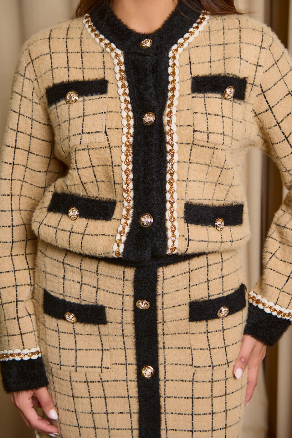Σετ σακάκι – φούστα πλεκτό με χρυσά κουμπιά κόσμημα μπεζ. Το σακάκι διαθέτει στρογγυλή λαιμόκοψη, τσέπες με σχέδιο πλεξούδα και κουμπί κόσμημα. Κλείνει με κουμπιά κόσμημα από πάνω μέχρι κάτω. Η φούστα είναι ίδια με διακοσμητικά κουμπιά κόσμημα και σχέδιο πλεξούδα στο τελείωμα, διαθέτει επίσης λάστιχο στην μέση για ελαστικότητα.