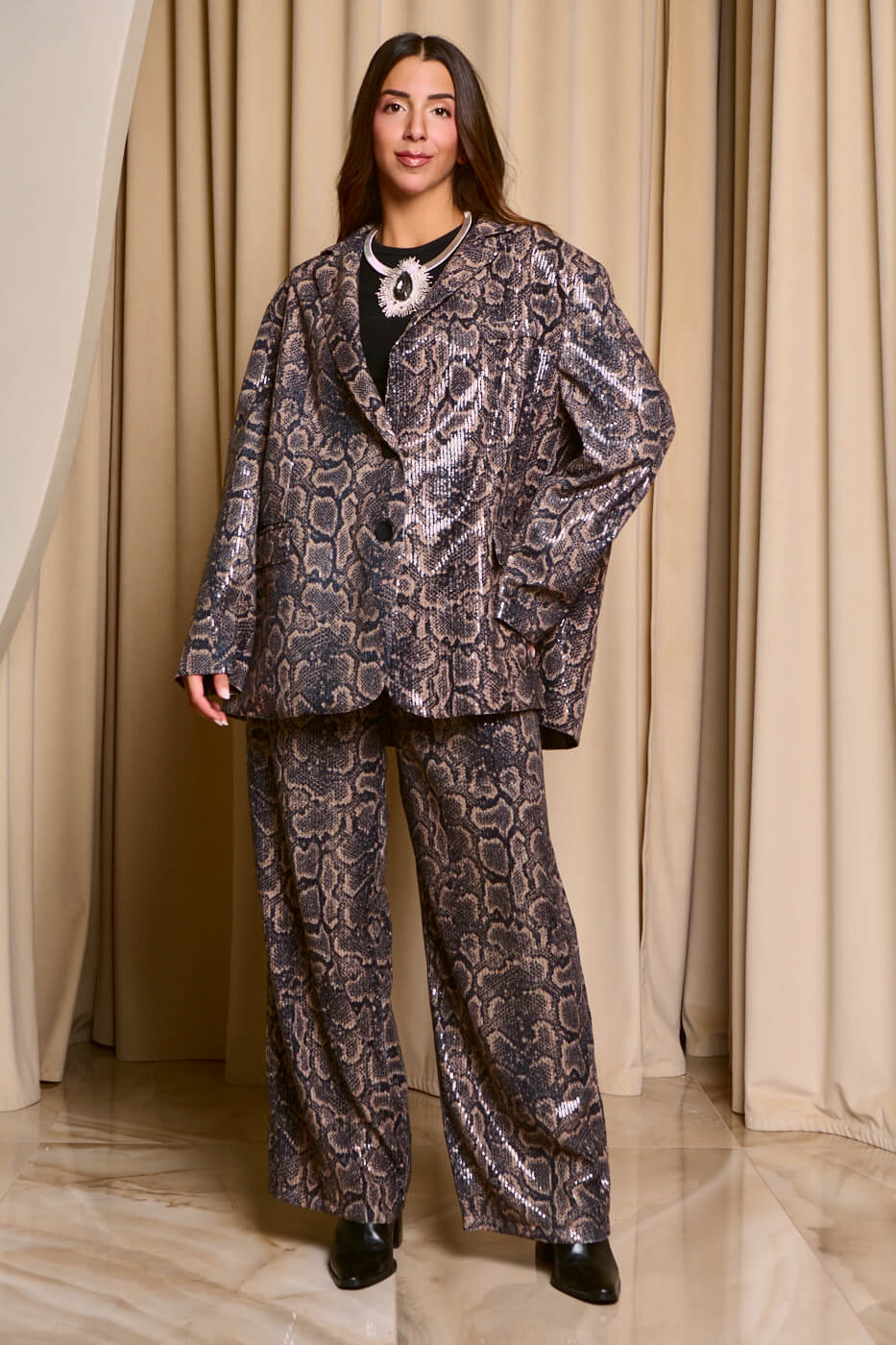 Σετ σακάκι – παντελόνι με παγιέτες snake print. Το σακάκι έχει γιακά, διακοσμητικές τσέπες μπροστά, κλείνει με τρία μαύρα κουμπιά και εσωτερική φόδρα. Το παντελόνι κλείνει με hook και φερμουάρ στο μπροστά μέρος, έχει τσέπες στο πλάι και είναι σε ίσια γραμμή. Διακοσμημένα και τα δύο με παγιέτες σε όλη την επιφάνεια με snake print.
