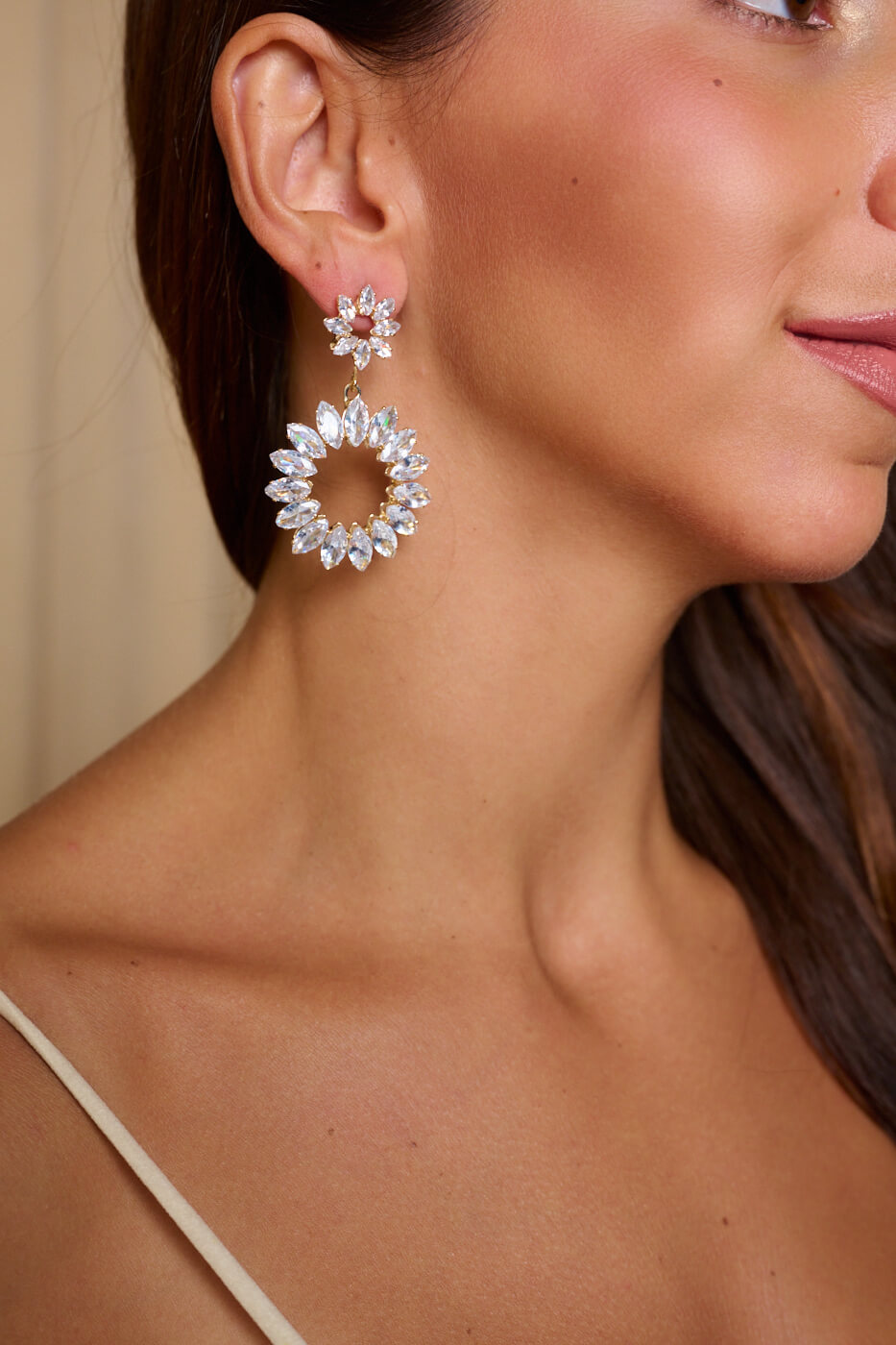 Σκουλαρίκια στρογγυλά με διαφανείς κρυστάλλινες πέτρες σε μορφή λουλουδιών χρυσά. Στο επάνω μέρος υπάρχει ίδιο σχέδιο σε μικρότερο κύκλο, προσθέτοντας ρομαντισμό. Ιδανικό για επίσημες περιστάσεις.
