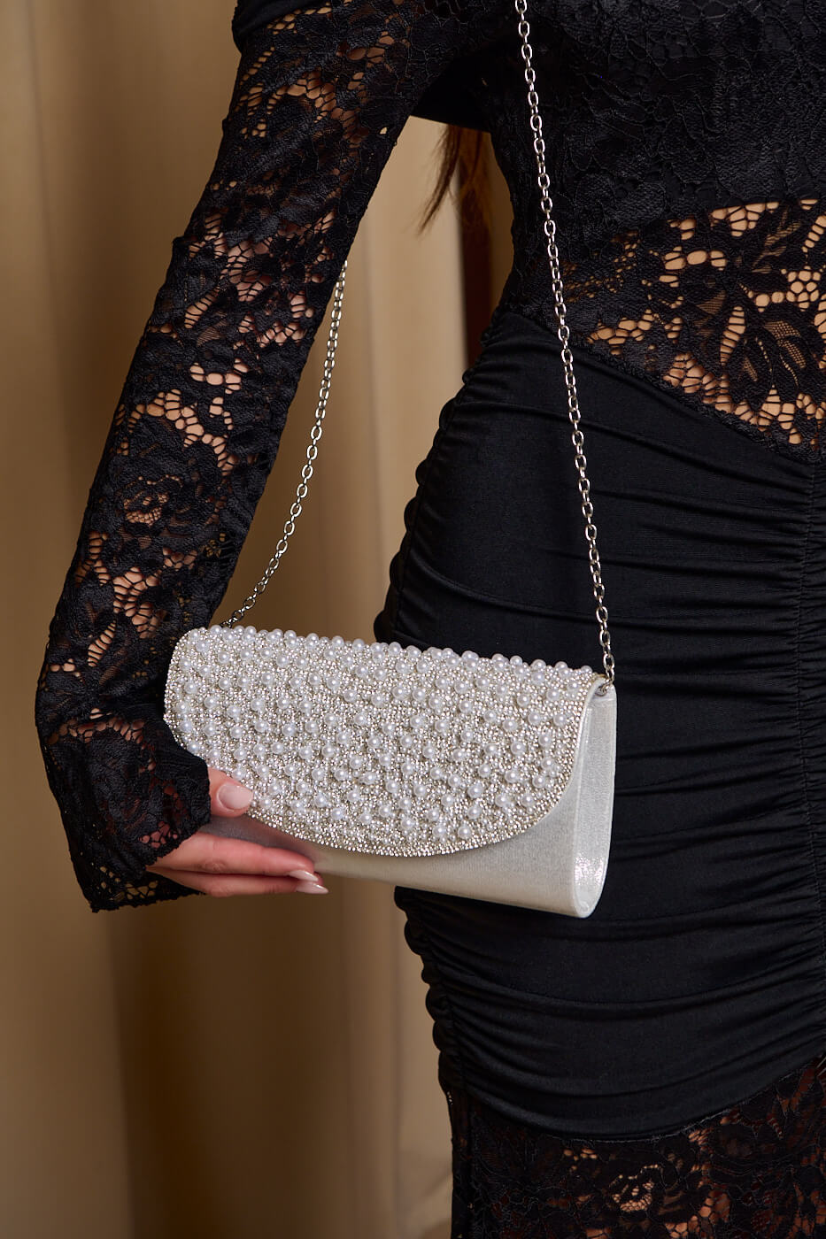 Tσάντα χειρός με πέρλες και στρας ασημί. Αναδείξτε κάθε σας εμφάνιση με αυτήν την κομψή τσάντα χειρός, διακοσμημένη στο μπροστά μέρος με στρας και πέρλες. Κλείνει με τρουκ μπροστά και διαθέτει αλυσίδα ώστε να φορεθεί στον ώμο, εσωτερική τσέπη και εσωτερική επένδυση.