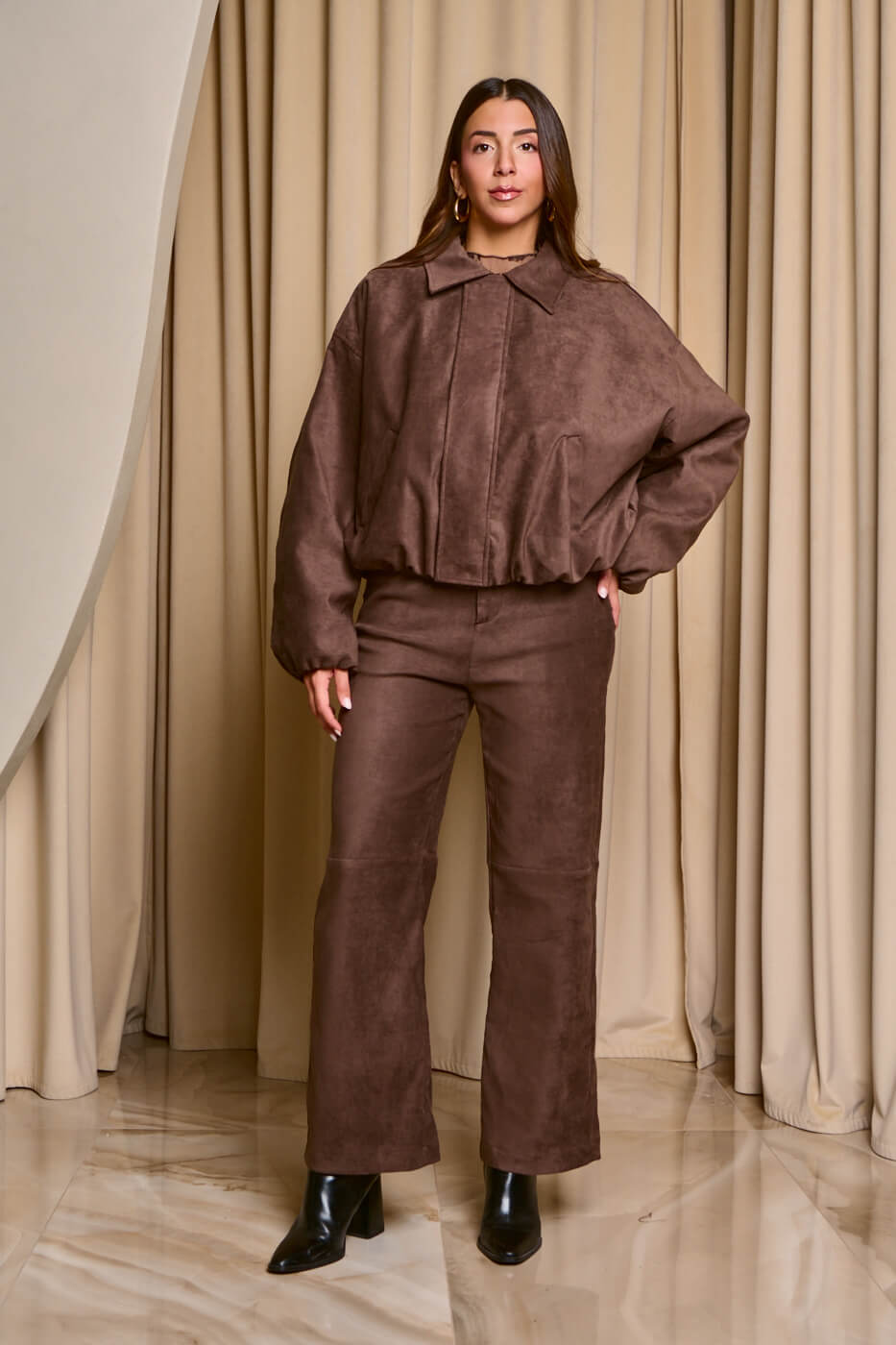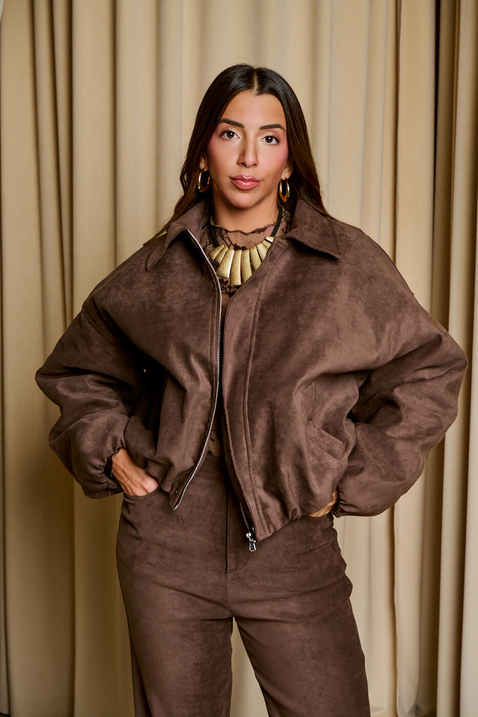 Τζάκετ bomber καστόρι με γιακά σκούρο καφέ. Bomber jacket με λάστιχο στο τελείωμα από τα μανίκια και στο κάτω μέρος, διακοσμητικές τσέπες στο πλάι, εσωτερική επένδυση και κλείνει με φερμουάρ και τρουκ.