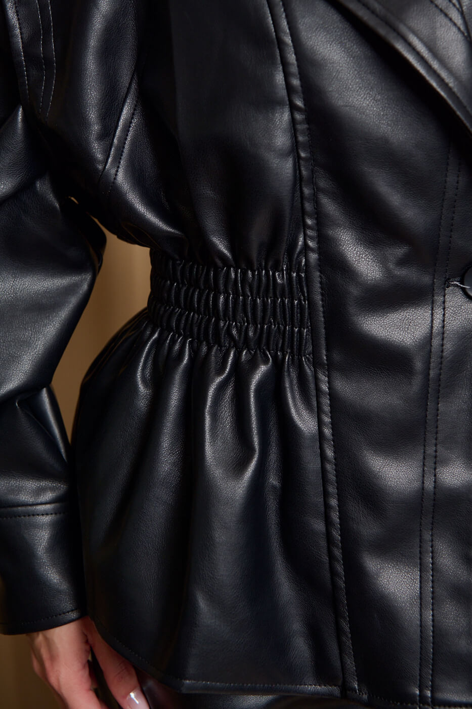 Τζάκετ δερματίνη μαύρο. Διαθέτει μοντέρνο oversized πέτο γιακά και φαρδιά μανίκια με μανσέτες στο τελείωμα. Επιπλέον, έχει λάστιχο που τονίζει τη μέση. Διαθέτει εσωτερική φόδρα και διπλό κλείσιμο με φερμουάρ και κουμπί.