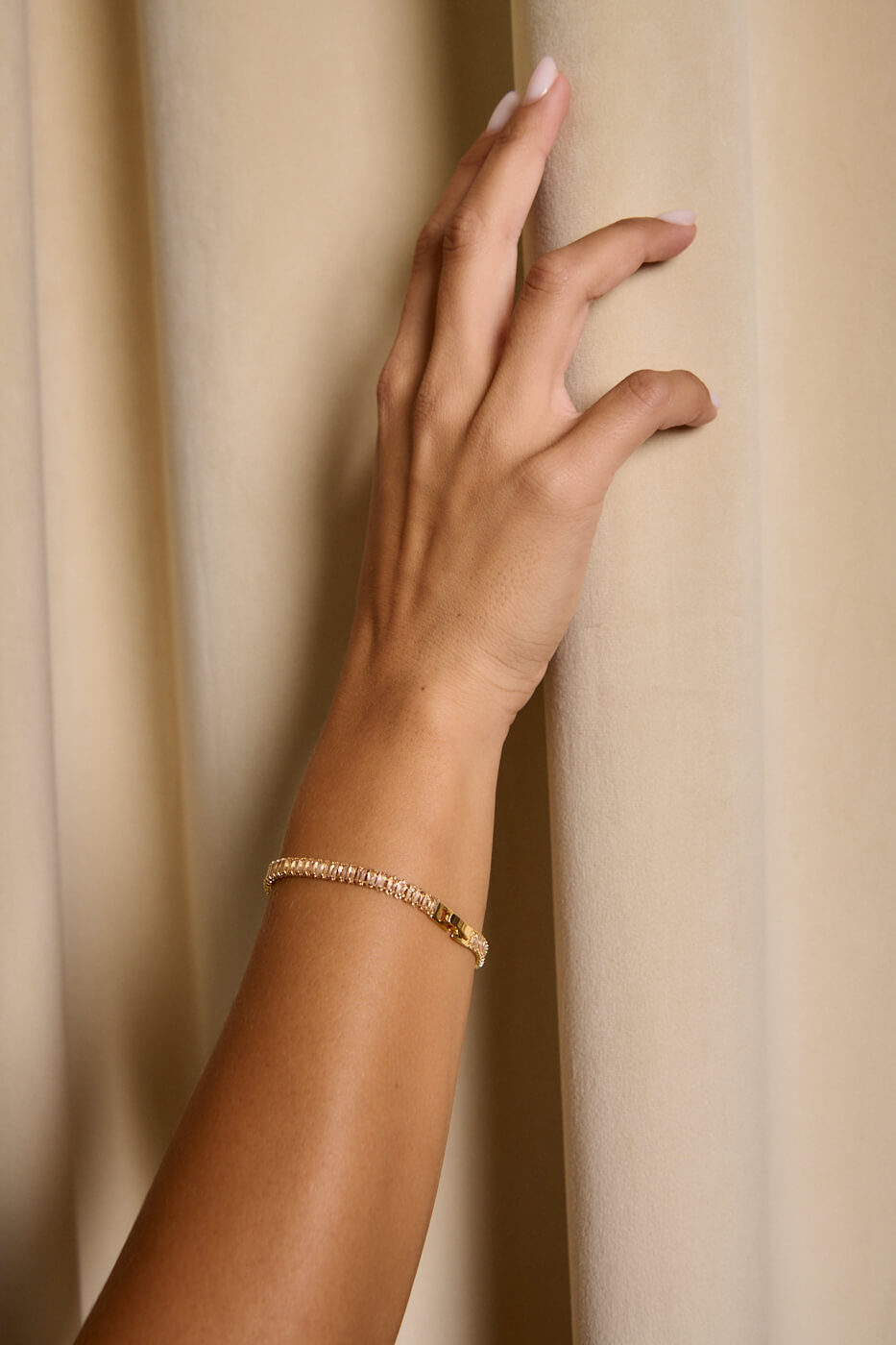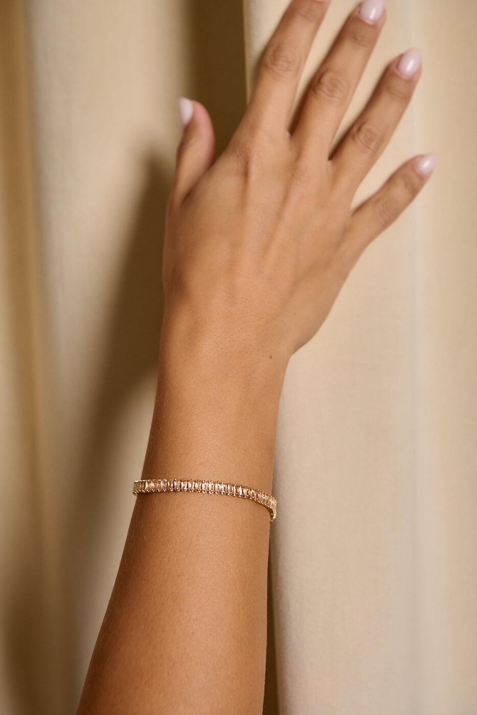 Βραχιόλι tennis με κρυστάλλους χρυσό . Ένα κομψό βραχιόλι τύπου tennis από ανοξείδωτο ατσάλι με λαμπερούς παραλληλόγραμμους κρυστάλλους που αντανακλούν το φως σε κάθε κίνηση. Ιδανικό για να δώσει μια πινελιά λάμψης σε κάθε εμφάνιση από το πρωί μέχρι το βράδυ. Ένα διαχρονικό κόσμημα που δεν πρέπει να λείπει από καμία συλλογή. Διαθέτει ασφαλές κούμπωμα. Περίμετρος 19cm.