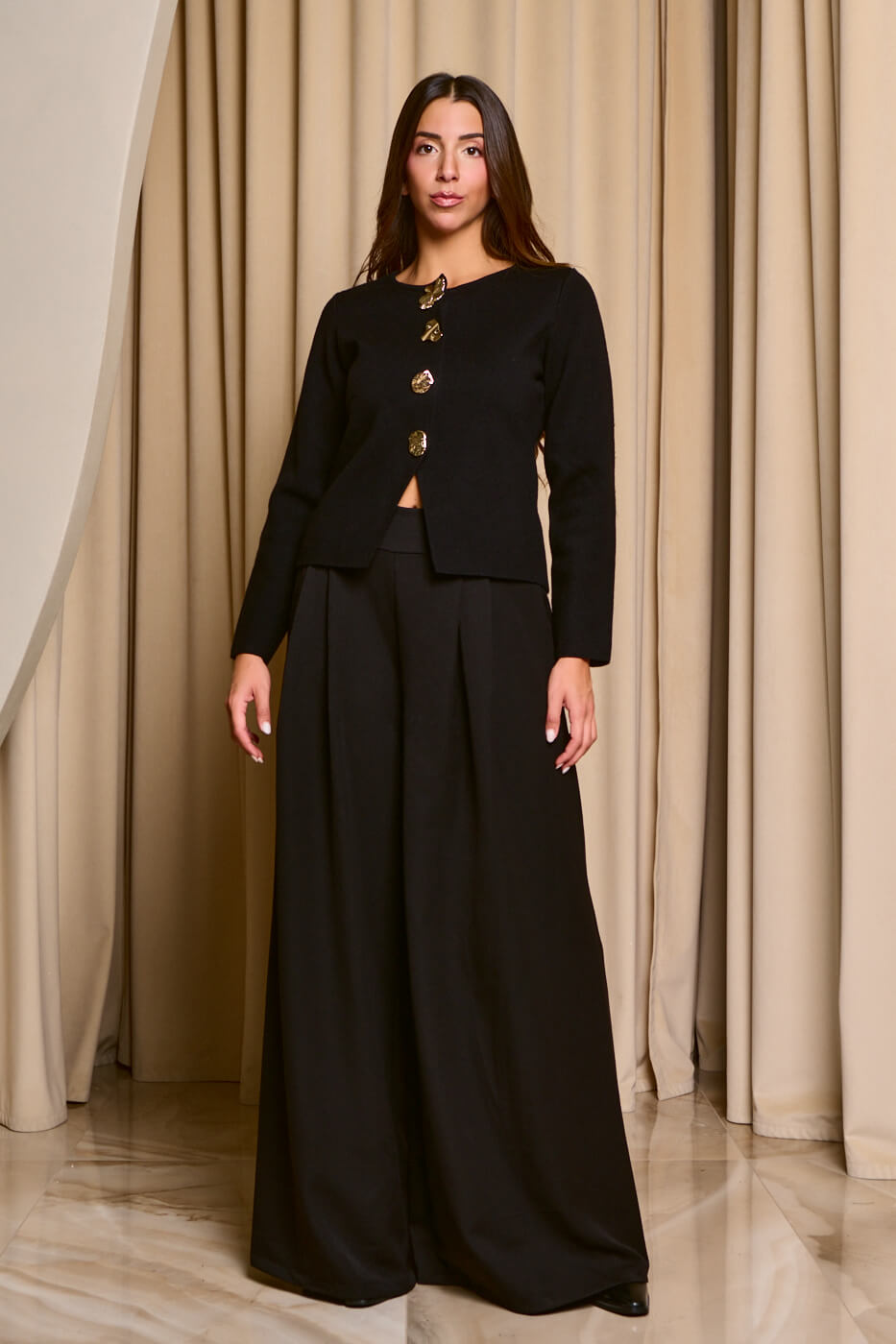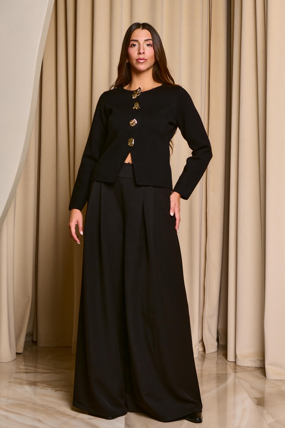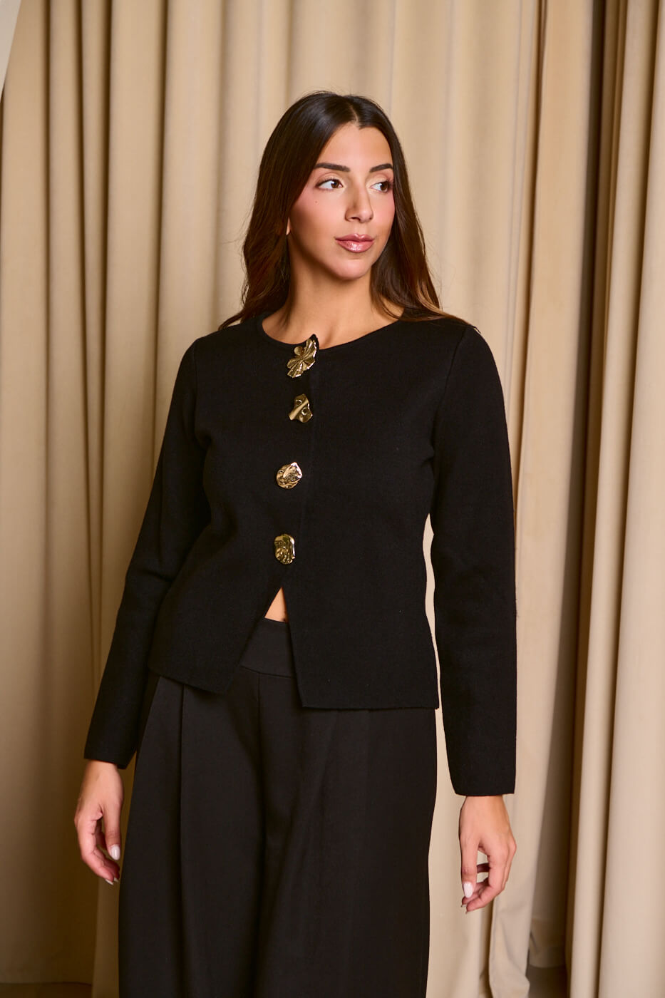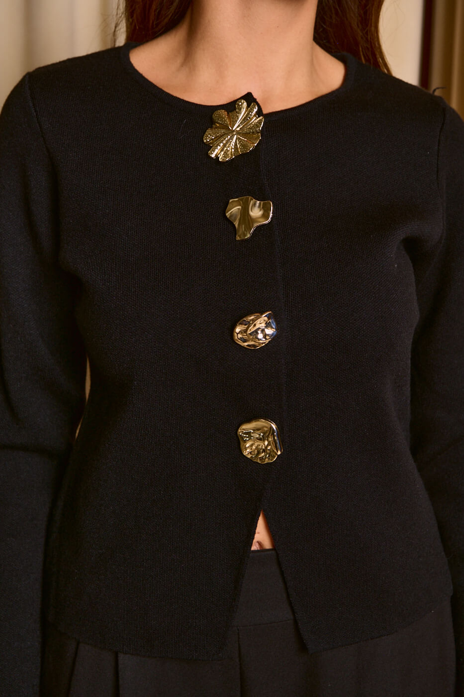 Ζακέτα πλεκτή με μεγάλα κουμπιά κοσμήματα μαύρη. Διαθέτει στρογγυλή λαιμόκοψη, μακριά μανίκια και κλείνει με μεγάλα χρυσά κουμπιά σαν κόσμημα.